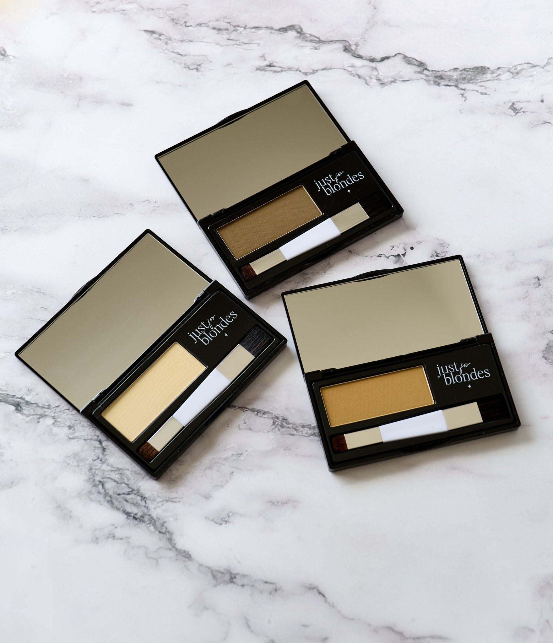 Just For Blondes Root Cover Up instantly covers grey roots and camouflages dark hair regrowth.